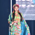 辻希美と俳優・杉浦太陽の長女で高校生インフルエンサー・希空(のあ)が登場。ロリータ風ドレス。赤とオレンジを基調に、袖がバルーンのように広がった生地にはポップなイラストが。また、赤いリボンがあしらわれたヘッドドレスや、ダックスフンド型のバッグなどの小物が、遊び心溢れる雰囲気をさらに引き立てている。