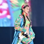 ブルーのロングベストをレイヤードしたカラフルでエスニック調のスタイルでステージに登場。圧巻のウォーキングでランウェイを歩き、会場を魅了した。