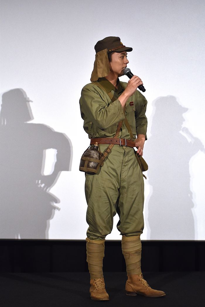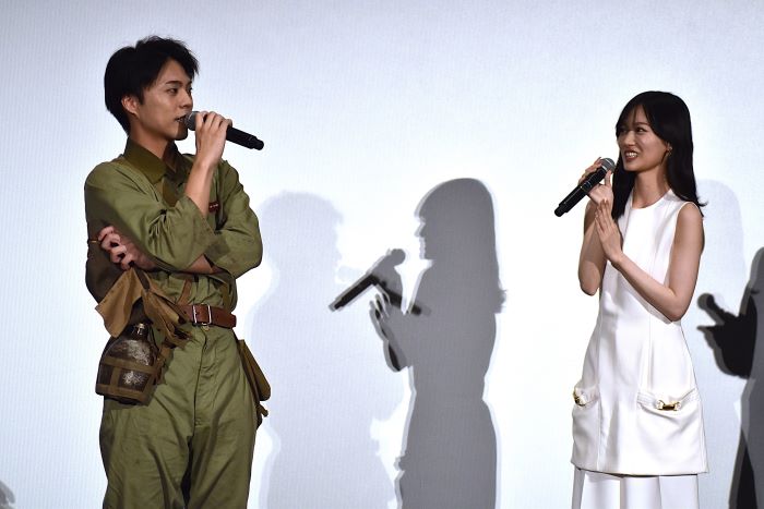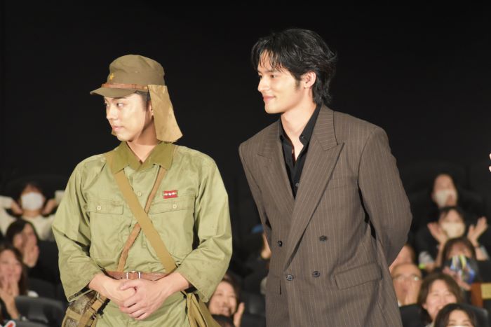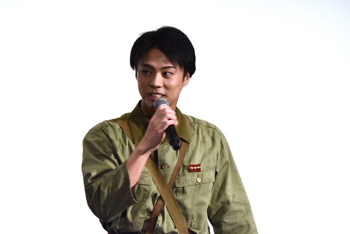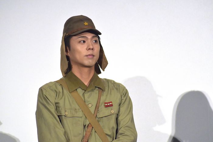 トークが盛り上がる中、さらに、客席の一角にスポットライトが当たると、そこには軍服姿の男性が登場。水上も「誰…?」と戸惑いを見せます。しかし、その人物が実際に貞市を演じた俳優・小野塚勇人であることが明かされると、驚きとともに会場からはどよめきが起こりました。