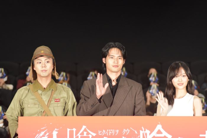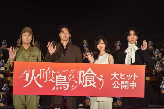 映画「火喰鳥を、喰う」の大ヒット御礼舞台挨拶が、10月16日、開催され、水上恒司、山下美月、Snow Man・宮舘涼太が登壇、イベント中には小野塚勇人がサプライズで登場しました。