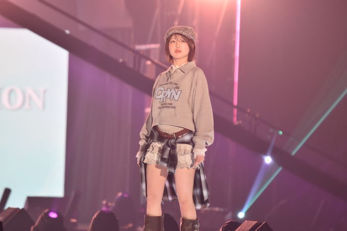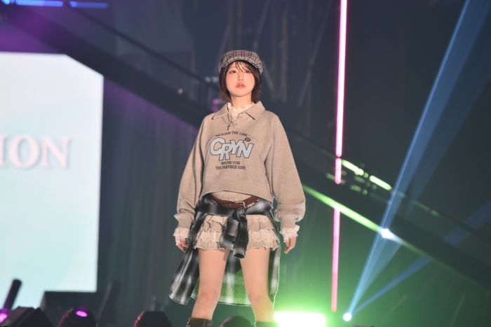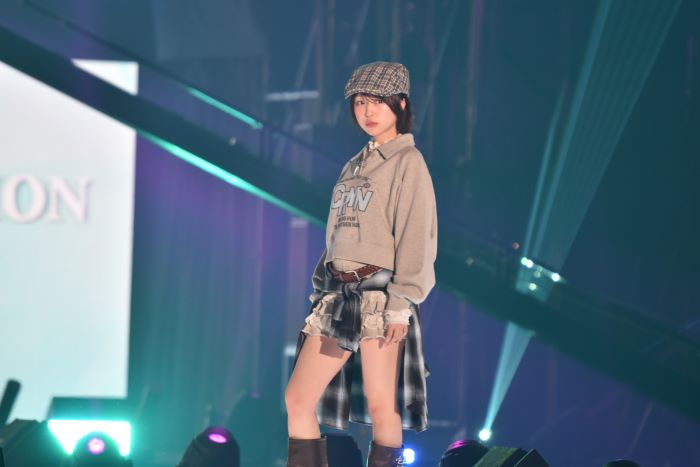 なえなのは、ミニ丈の衣装を着用したスタイリングで登場した。腰にはチェックシャツを巻き、細ベルトやキャスケットなどの小物を取り入れたコーディネートとなっていた。