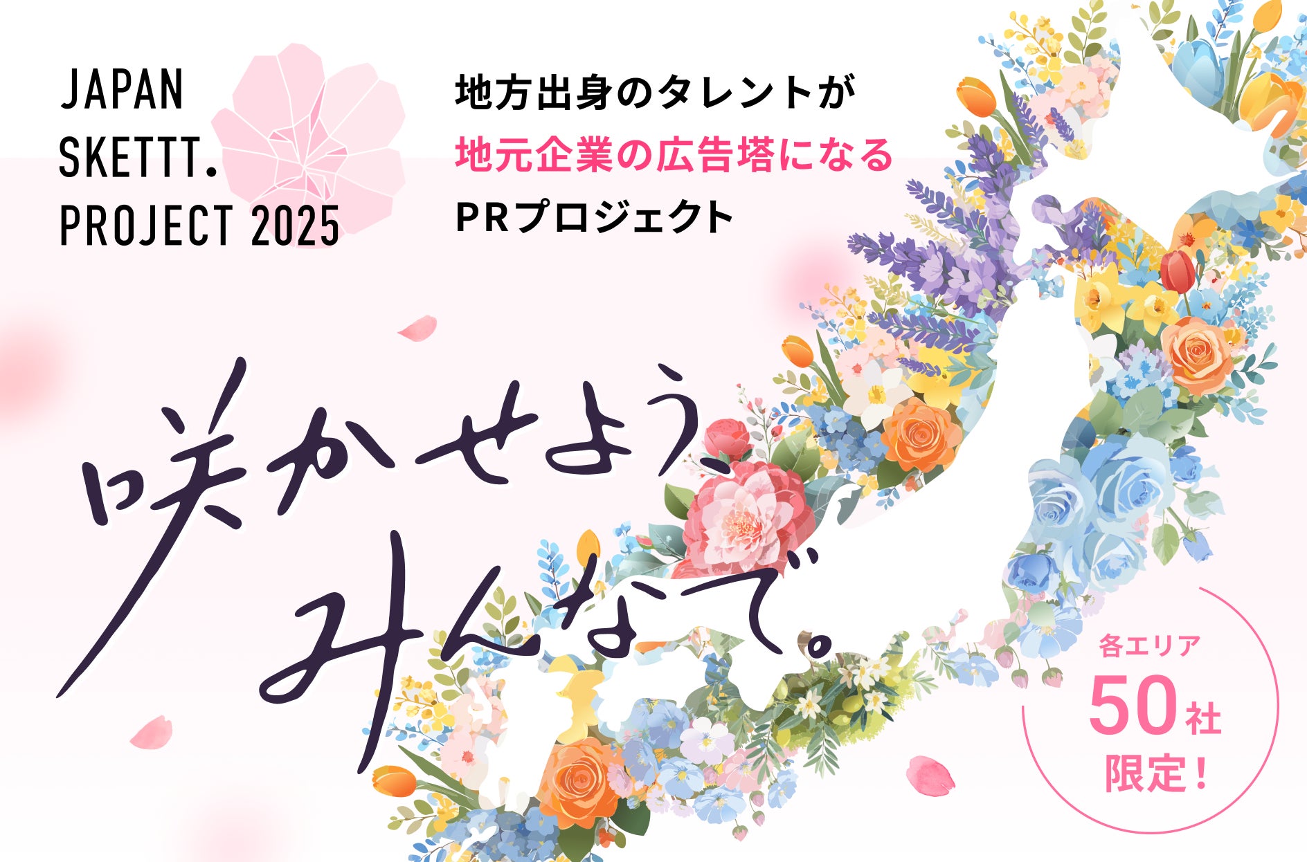 「JAPAN SKETTT. PROJECT(ジャパン・スケット・プロジェクト)」は、「咲かせよう、みんなで」をキャッチコピーに、地方出身タレントがPRでお困りの地元企業様を支援するプロジェクトです。まち・ひと・しごと創生法が施行されるなど、国を挙げて地方創生が進められているなか、都市部と地方の経済格差や東京一極集中は大きな課題となっています。