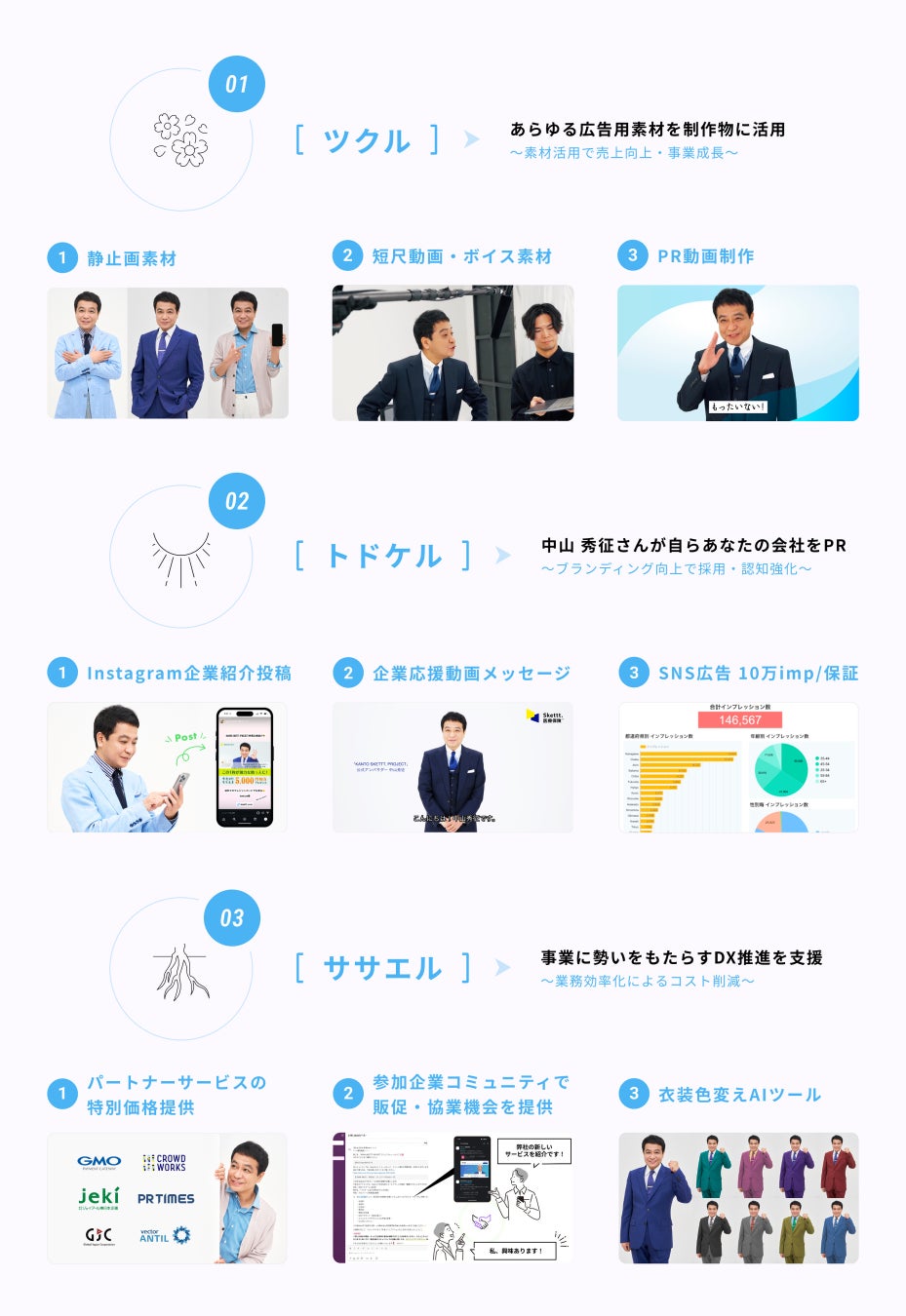 具体的には、地方出身のタレントの静止画/動画素材(ツクル)、タレントによるSNSでの告知や応援動画メッセージ(トドケル)、各パートナー企業によるサービス優待(ササエル)といった、さまざまなサポートがセットになった、革新的なプランです。