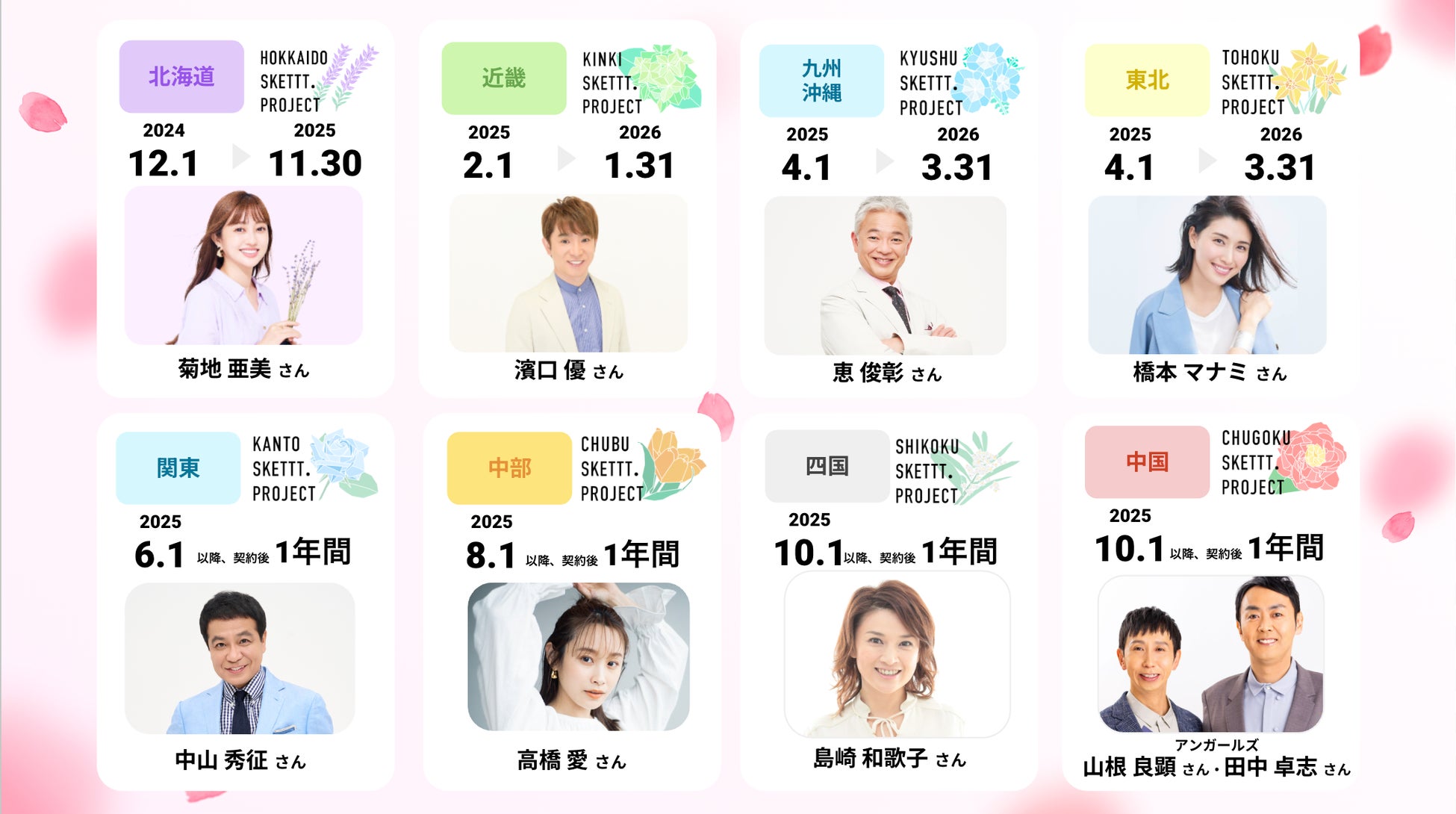 「JAPAN SKETTT. PROJECT(ジャパン・スケット・プロジェクト)」は、「咲かせよう、みんなで」をキャッチコピーに、地方出身タレントがPRでお困りの地元企業様を支援するプロジェクトです。全国8エリアごとに地元出身のタレントがアンバサダーとして就任し、地元を盛り上げます。