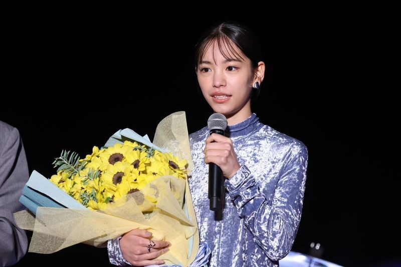 そしてORANGE RANGEが再び登場し、ジュエルミネーションについては、RYOが「僕らの生まれ育った沖縄にはない規模感で素晴らしいですね」と少しユーモアも交えて絶賛し、楽曲についてもHIROKIが「映画を観てから楽曲を制作したのですが、悪役もおらずすごく純粋な映画で。そういった世界観や本当に素敵な人物たちの心の動きや変化を意識して制作させていただきました」と制作にかけた思いを存分に語ったところで、よみうりランドから當真と齋藤へ映画大ヒットをお祝いする100本のひまわりで作られた花束ブーケのサプライズプレゼントが! よみうりランドのマスコットキャラクター、グッド&ラッキーから2人へ手渡され、嬉しげな表情を見せると、「こんなに立派なブーケをもらえる機会はないので嬉しいですし、とてもいい香りです」(當真)、「こんなにたくさんのひまわりを抱えたことはないですし、こんな素敵な日にいただけて、胸がいっぱいです」(齋藤)と感謝を伝えていた。