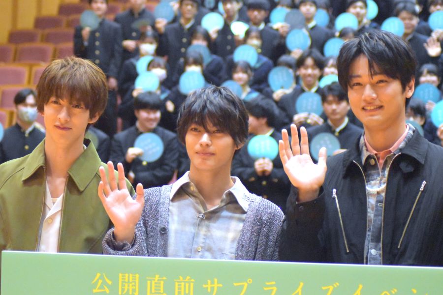 MCが映画に関するイベントであることを明かし、本作の予告映像が上映された後、キャスト陣がサプライズ登場した。神尾楓珠、中川大輔、伊藤あさひが次々と姿を現すと、会場は大きな歓声と拍手に包まれ、驚きと興奮の表情を見せる生徒も多く見られた。キャスト陣は時折手を振ったり笑顔を見せたりしながら、温かい反応に応えつつステージへと登壇した。