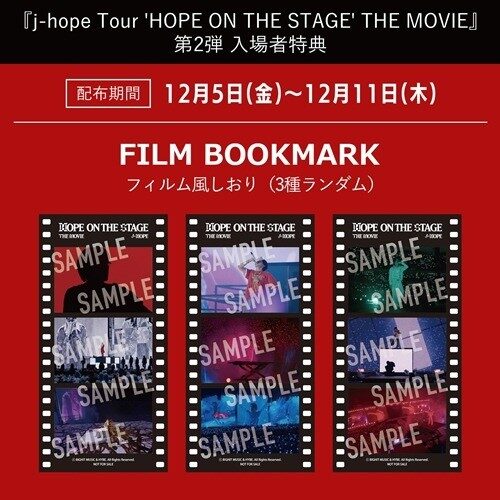 さらに、12月5日(金)から配布がスタートする入場者特典・第2弾も決定。特典は「フィルム風しおり(3種ランダム)」で、本編に登場するJ-HOPEのライブパフォーマンスから選りすぐりの3シーンを1枚にまとめた、エモーショナルなデザインとなっている。
