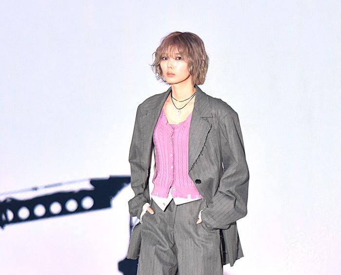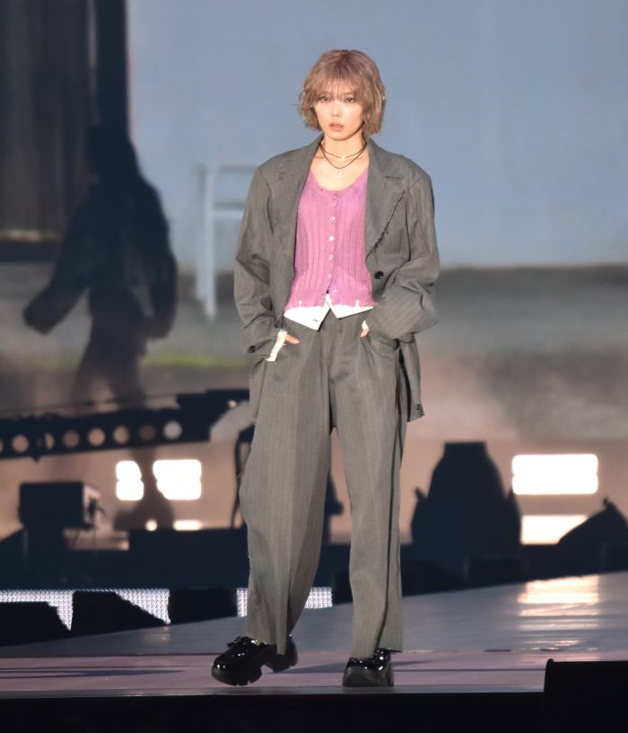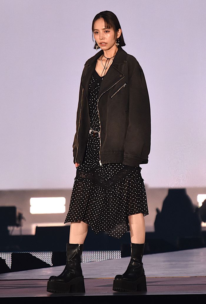 山崎は「1st SHOW」SLYステージに登場し、ロングブーツとタイトなミニスカートを合わせたカジュアルなコーディネートで、スタイルの良さが際立つ装いを披露しました。