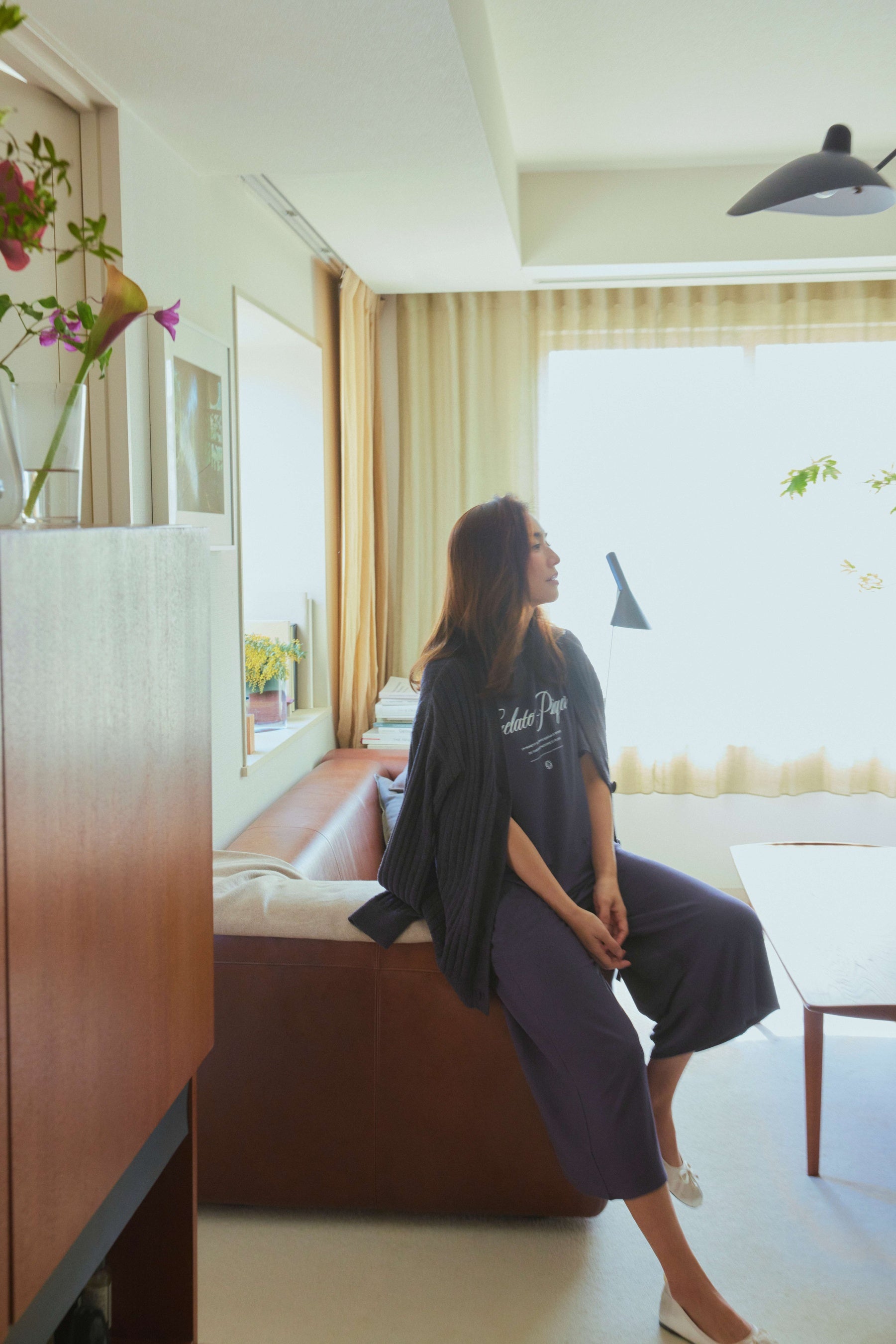 ワンピースは、身体のラインを拾いすぎず、カジュアルでありながらもエレガントなシルエットに。