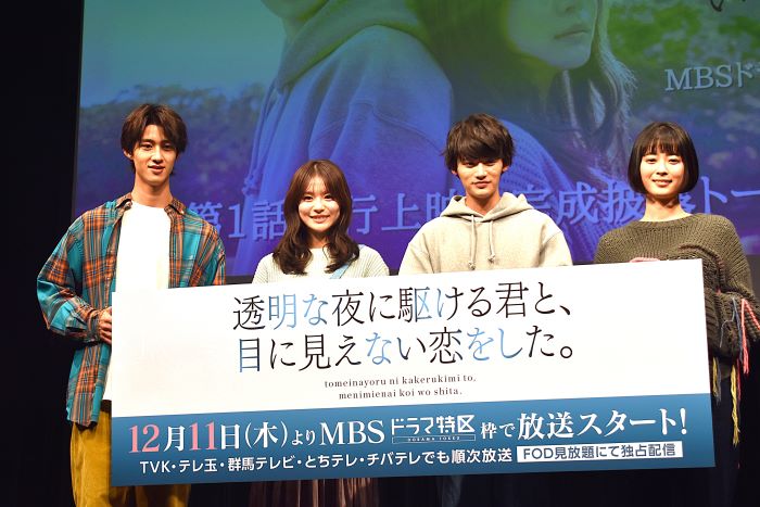 俳優の永瀬莉子が3日、都内で行われたMBSの連続ドラマ『透明な夜に駆ける君と、目に見えない恋をした。』(木曜深夜0時59分)1話先行上映会&トークイベントに、永瀬と同じくダブル主演を務める藤原大祐をはじめ、曽野舜太(M!LK)、河村花と共に登壇した。