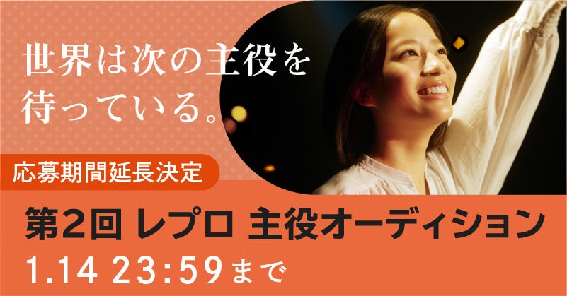 この度、株式会社レプロエンタテインメントは、「レプロエンタテインメント 第2回 主役オーディション」の応募期間を延長することが決定しました。今回、応募に間に合わなかった方から多くのお問い合わせがあり、そういった方を対象に応募を受け付けることにいたしました。延長期間は、2024年1月10日(水)10:00~1月14日(日)23:59までとなります。