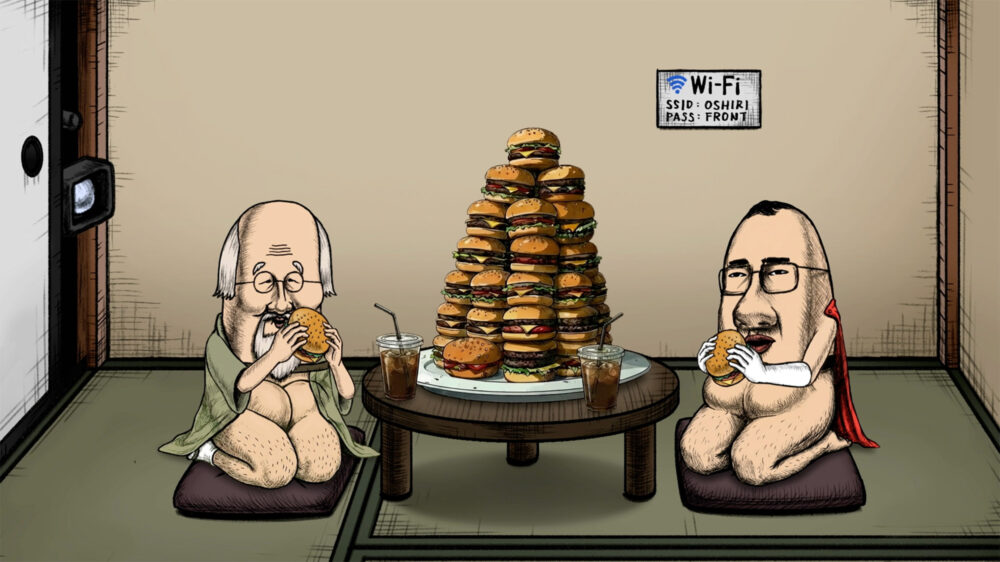 さらに、かつて存在したと⾔い伝えられる“おしり前帝国”の復活を⽬論み、⼈々を⽀配しようとする「おしり前帝国復活計画」を唱える組織・⿊幕製薬四天王の姿や、おしり前マンの師であり先代おしり前マンでもある「おしり前レジェンド」との久しぶりの再会シーンも登場。⼤量のハンバーガーを頬張る姿など、ユニークなカットの数々は、⾕⼝監督の世界観が凝縮された仕上がりとなっている。