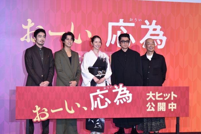 10月17日、映画『おーい、応為』の初日舞台挨拶が東京・TOHOシネマズ日比谷で行われ、主演の長澤まさみさんをはじめ、共演の髙橋海人(King & Prince)、大谷亮平、永瀬正敏、大森立嗣監督が登壇しました。本作は江戸時代を舞台に、破天荒な絵師・葛飾北斎(永瀬正敏)と、その娘で弟子でもあった葛飾応為(長澤)の人生を描いています。