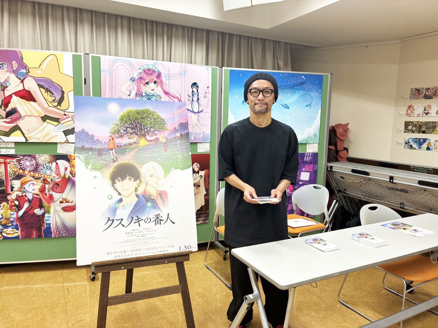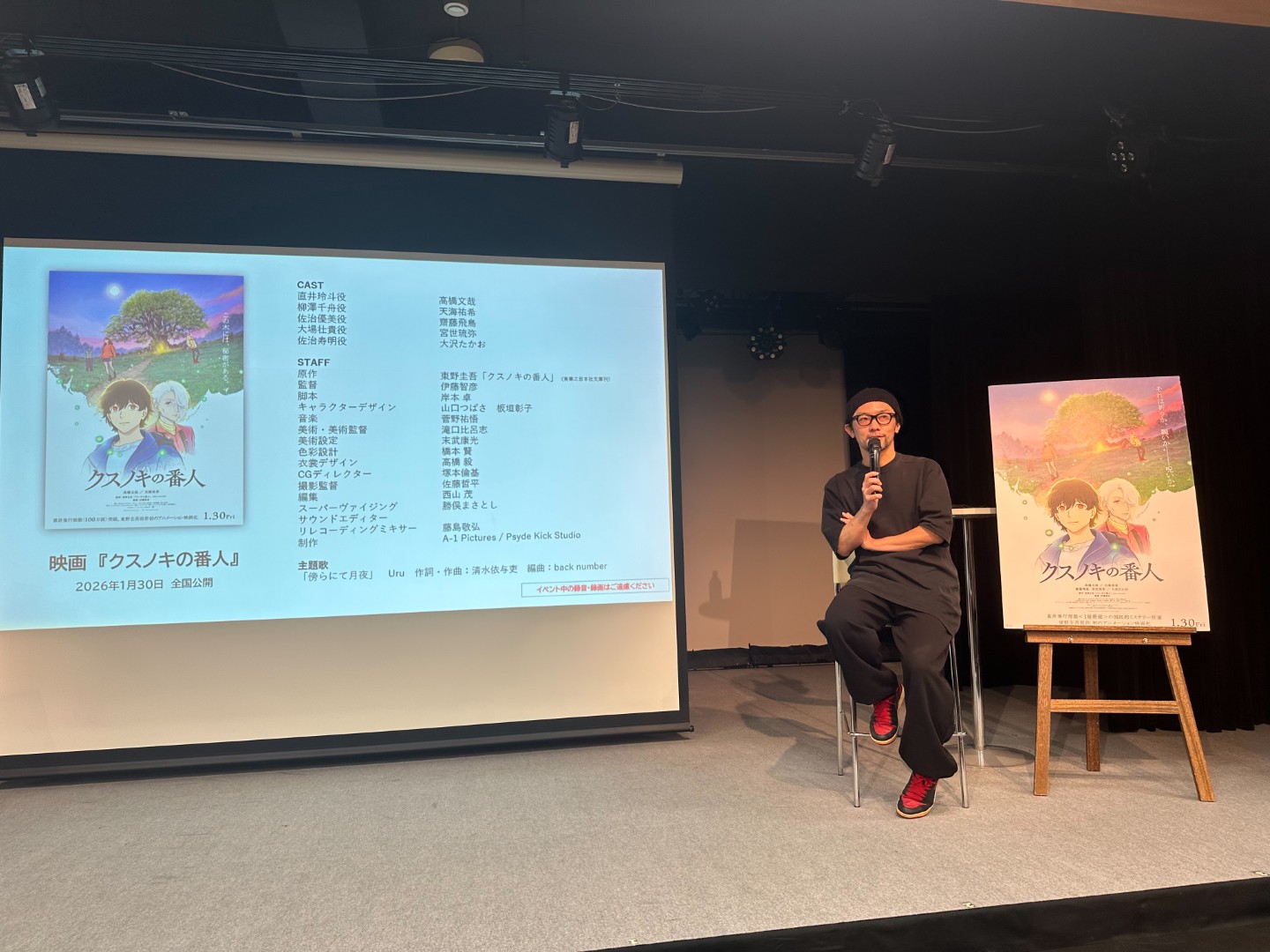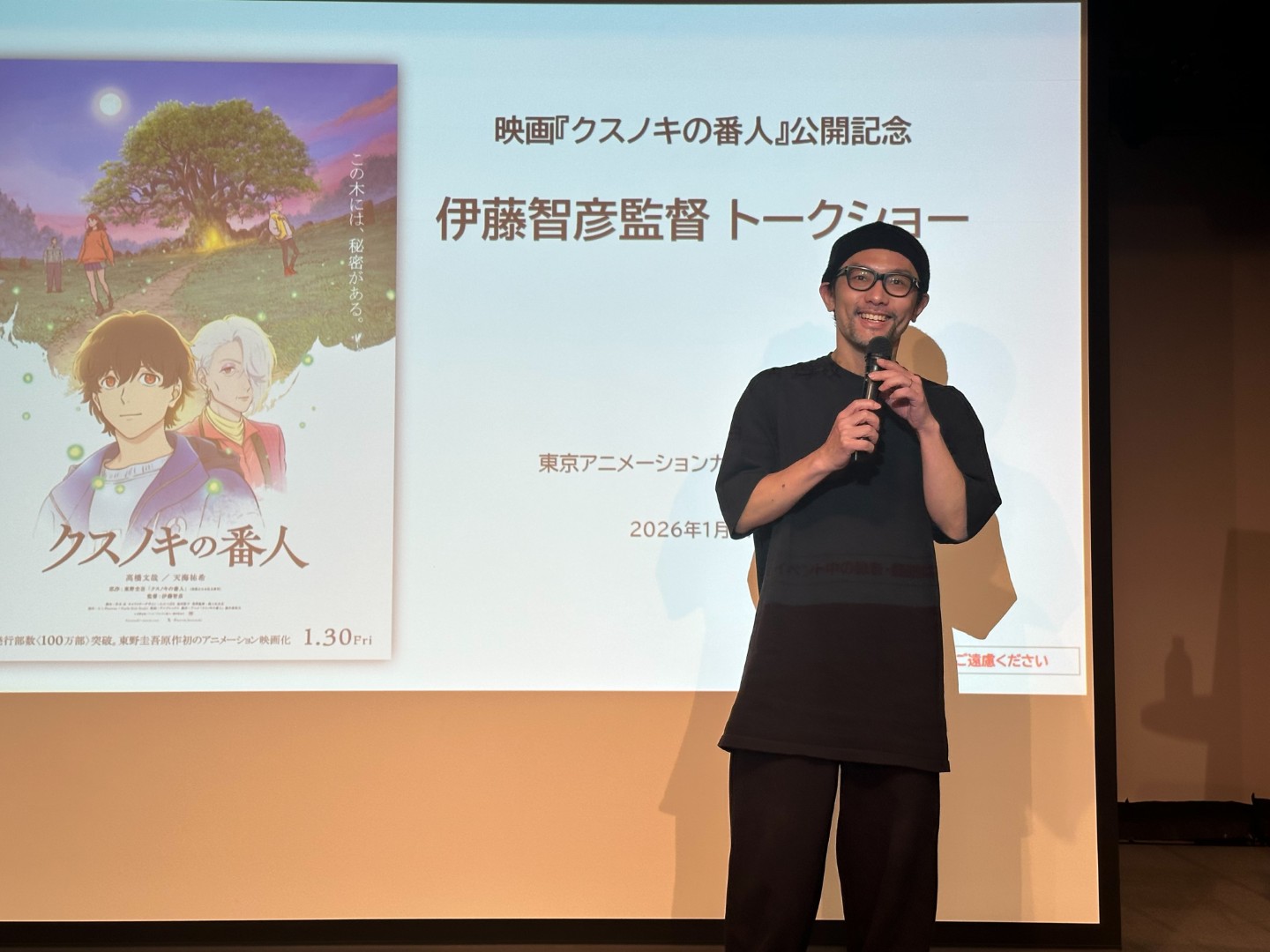 さらに、物語を彩る重要な役どころに、父親の秘密を探る佐治優美役・齋藤飛鳥、和菓子老舗メーカーの跡取り息子大場壮貴役・宮世琉弥、家族に秘密でクスノキの祈念に通う佐治寿明役・大沢たかおが出演、実力派キャストの勢揃いに大きな反響を得ている。加えて、監督・伊藤智彦(「ソードアート・オンライン」シリーズ、「僕だけがいない街」『HELLO WORLD』)を筆頭に、脚本・岸本卓(「ハイキュー!!」「ブルーロック」シリーズ)、キャラクターデザイン・山口つばさ(『ブルーピリオド』原作者)、板垣彰子(『かがみの孤城』)、美術監督・滝口比呂志(『天気の子』)、音楽・菅野祐悟(東野圭吾原作『ガリレオ』シリーズ、連続テレビ小説「半分、青い。」)をはじめ、本作を形作るスタッフにもいずれも精鋭が集結!さらに主題歌は、back number楽曲提供による本作書き下ろしの楽曲となる、Uruの新曲「傍らにて月夜」に決定!先日ついに本作がお披露目され、「心震える作品」「最後のシーンはもう‥涙腺崩壊」「見事な映像美と、ラストに次から次へと感動の波が押し寄せてきた。」「想像を超えて心が温かくなった。」など絶賛の声が続出。人生を諦めて生きてきた青年・直井玲斗が月郷神社に佇む「クスノキの番人」になり、様々な人との出会いを通して人生を彩っていく本作によって“暖かな感動の輪”が広がっている。公開に向けて注目が集まる中、監督・伊藤智彦が、東京アニメーションカレッジ専門学校を訪問!映画の公開を記念したトークショーが開催となった。
