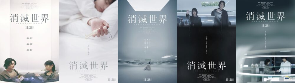 いずれも『消滅世界』を象徴するビジュアルで、性愛のない結婚生活を送る雨音と朔が服を着たままバスタブに身を沈めるビジュアルでは〈恋愛/結婚/家族〉が打ち消され、雨音が恋する“ラピス”のフィギュアを手に眠るビジュアルには〈性が消えた楽園〉、エデンの子どもたちが集う公園のビジュアルには、雨音の脳内でリフレインされる〈正しさという聞こえない音楽が私達の頭上で響いている〉、エデンの真っ白な公園で黒装束の二人が謎の白い粉を撒くミステリアスなビジュアルには〈私達はこの世界を食すべきた〉、そして“ラピス”を共に愛する水内(結木滉星)との密かな約束を交わすビジュアルには〈まだ見ぬほんの少し先の世界〉と、それぞれ本作のテーマ性に迫る鮮烈なキャッチコピーが付けられた。