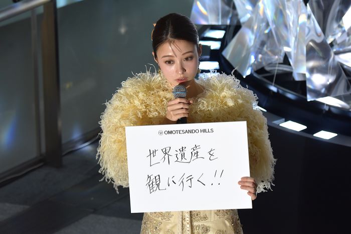 トークセッションでは「新たに挑戦したいこと」をテーマに、「世界遺産を見に行く」と書いたフリップを掲げ、「海外旅行が好きなので、ピラミッドやマチュピチュなどに行ってみたい」と話した。