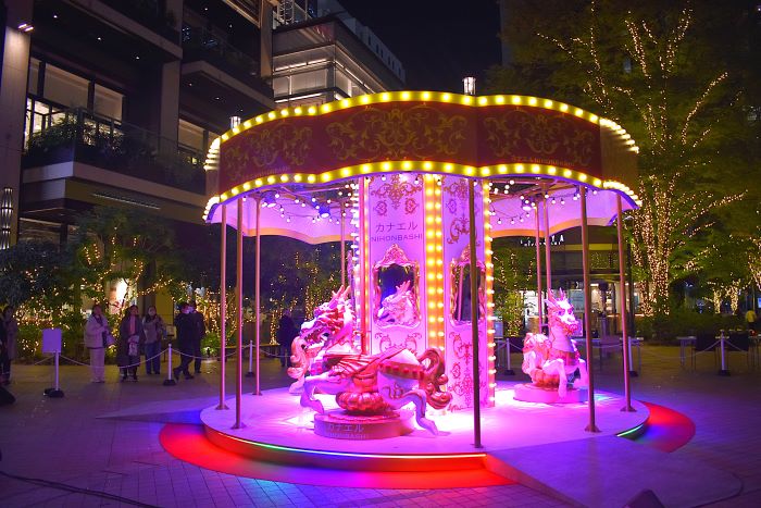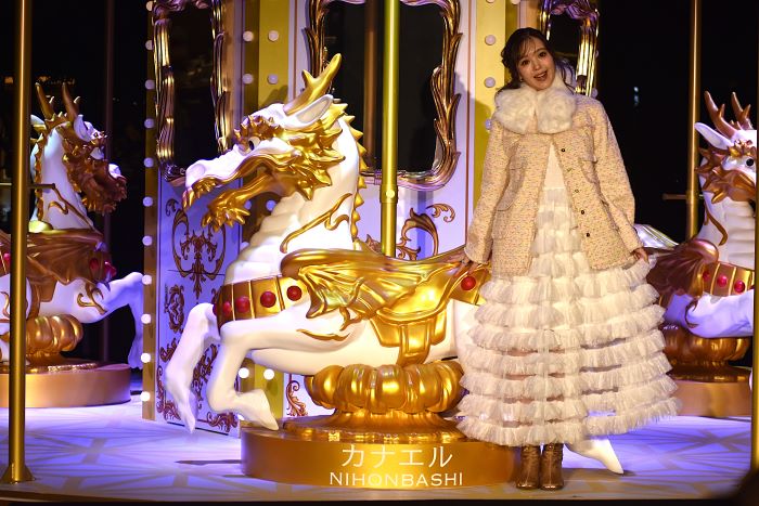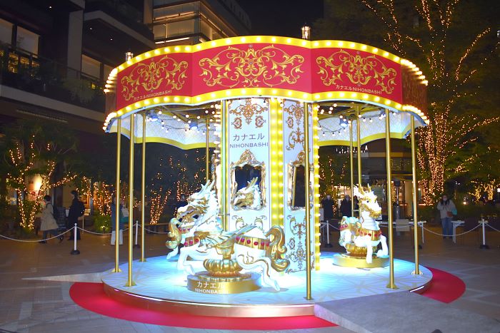 大屋根広場に、幸福を呼び込む麒麟像をモチーフにしたきらめく“麒麟ゴーラウンド”が初登場!日本橋ならではの翼が生えた麒麟に乗って、福を招きましょう。