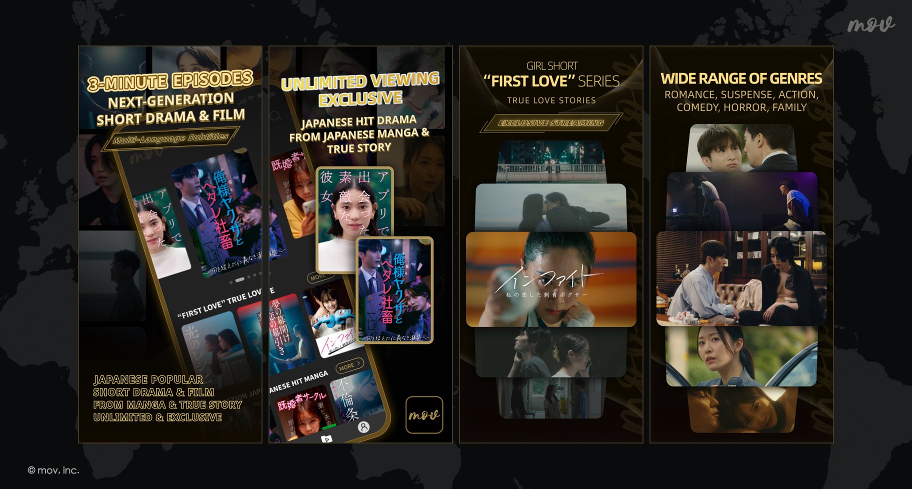 mov株式会社(本社:東京都港区青山、代表取締役CEO:ジェイソン・ウォン)は、世界174以上の国と地域でサービスを展開する日本発ショートドラマ&映画アプリ「mov」(読み:ムーブ)にて、本日より正式にサービスを開始し、それに伴って全オリジナル作品の配信がスタートしました。